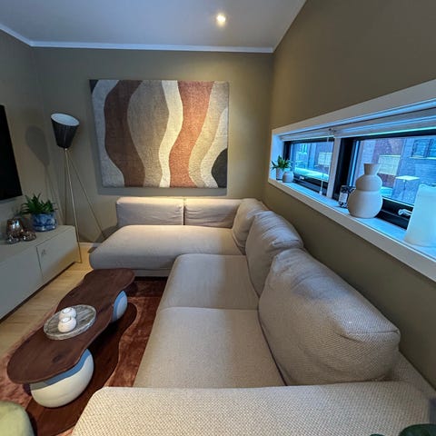 Sofaen har et ekstra stort hjørne og er veldig behagelig å sitte i. Endene har et komfortabelt avrundet armlen.