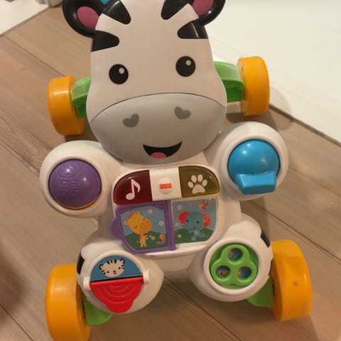 Laget av KI: Fisher-Price aktivitetsleke i form av en bamse med lydfunksjon. Leken har fargerike tekstilbokstaver på magen og ulike teksturer på poter og ører. Materialet er mykt stoff, egnet for små barn.