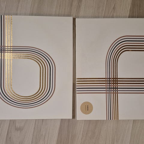 Inneholder to bilder med fargerike, abstrakte motiver av aper. Hvit ramme med veggmonteringsfester på baksiden. Passer til veggdekorasjon.