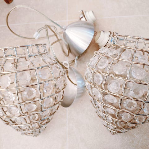 Selger fem identiske taklamper som tidligere har vært brukt i butikk. Lampene har et dekorativt, bohemsk uttrykk og fremstår som særpregede og stemningsskapende, men bærer tydelig preg av bruk.