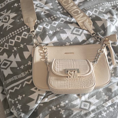 Michael Kors Delancey Satchel dameveske i hvitt lær. Vesken har en topphåndtak og avtagbar skulderrem for fleksibel bruk. Den har en klaff med magnetisk lukking og et romslig hovedrom med innerlommer for organisering. Kjøpt på zalando for 11 mnd siden. Brukt 4-5 gang.