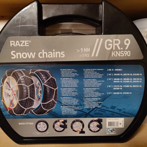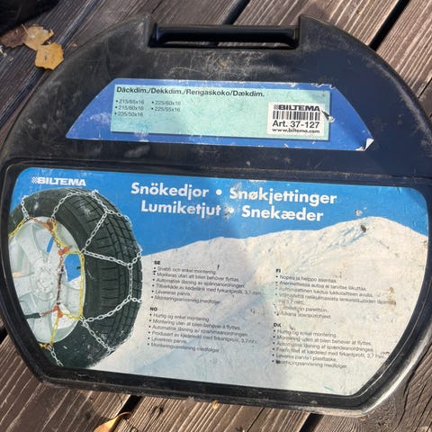 Kjettinger selges. Brukt et par ganger over kort avstand. Ser ut som nye. Passer til flere typer dekk/hjul. Brukt på en Skoda Octavia.