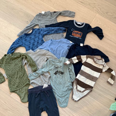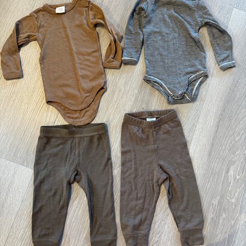 Selger ullpakke med 5 dresser/pysjer, en hjemmestrikkede sparkebukse, samt body og strømpebukse