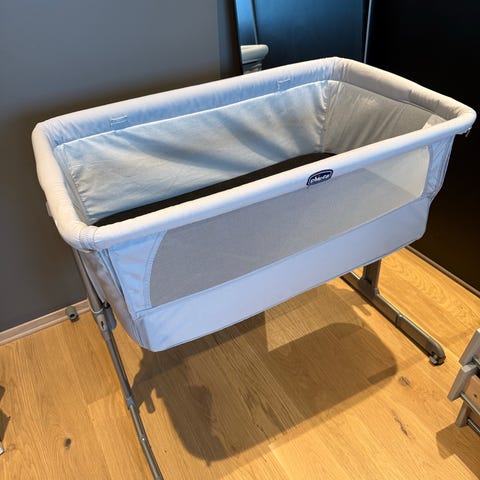 Chicco bedside crib med lys grå farge og stoffmateriale. Designet for å plasseres ved siden av foreldresengen for enkel tilgang til barnet. Har justerbare funksjoner for tilpasning til ulike sengestørrelser.
