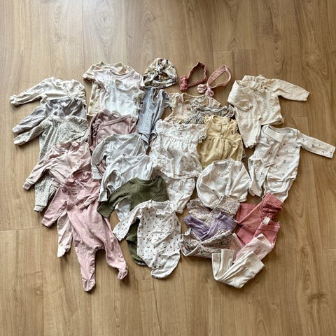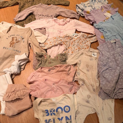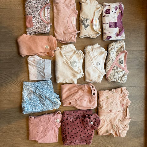 6 x byxa, 3 x body, 2 x sett (byxa + overdel), 2 x kortärmad kjole, 1 x kortärmad body, 1 x hettegenser i fleece.