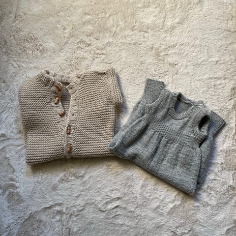 Selger to ulldresser og en sparkebukse. Ser at det er noen flekker (se bilder) men det har ikke vært forsøkt fjernet. Det har vært lite brukt.