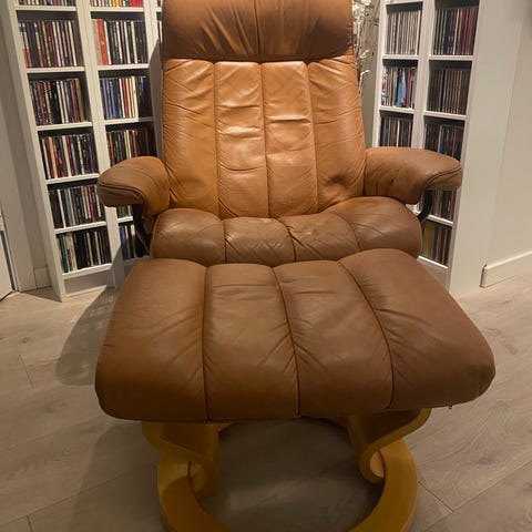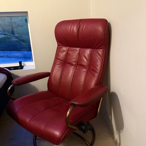 Stressless fra Ekornes i mørkegrønt skinn med lyst tre.