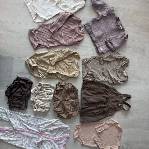 flere fine og noe litt mer brukt -newbie ,H&M,name it,hust&claire,Lindex,Cubus,new born .Kan sende hvis kjøper betale porto .5 kjoler,8 body long arm,2. body kort arm,1 genser,6 bukser,sokker og strømpebukse