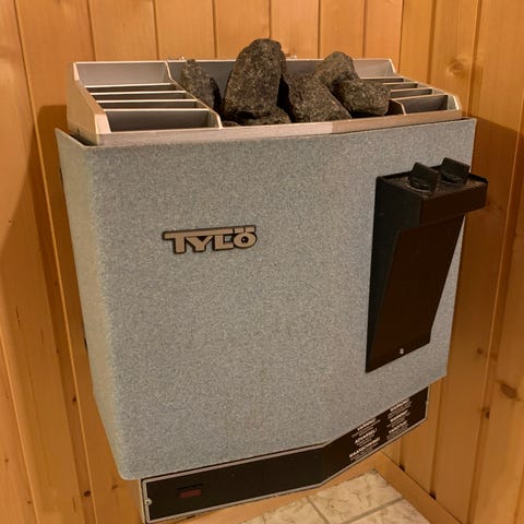 badstueovn med badstueinteriør inkludert benker, bøtte m/øse, lys, termostat osv. Badstuen har trepanel og glass i dør. Steiner følger med ovnen.
