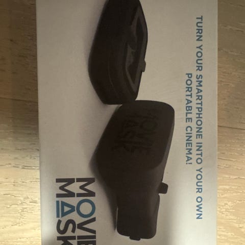 Norskutviklede Moviemask Premium i fargen svart. Med denne kan du ved å hekte inn en mobiltelefon ha din egen, portable «hjemmekino». Fungerer med all slags innhold som kan vises på en mobilskjerm, alt fra streaming til droneflyging. Gir med spesialutviklede linser et overraskende godt bilde.
