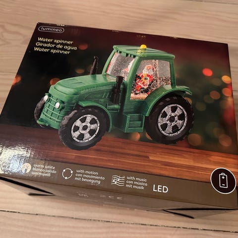 Den er 45 cm høy, det er tre ting som går rundt; toget tøffer rundt, barna på skøyteisen og juletreet. Det spilles flere julesanger etterhverandre. Musikken kan slåes av. Koselig!