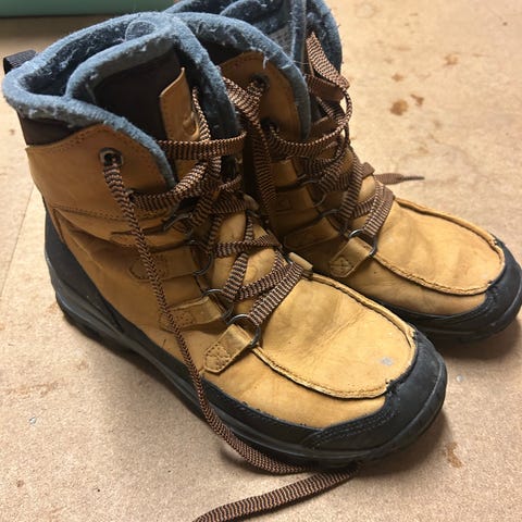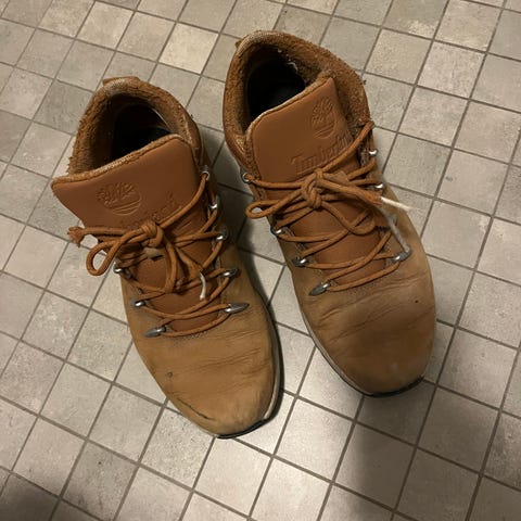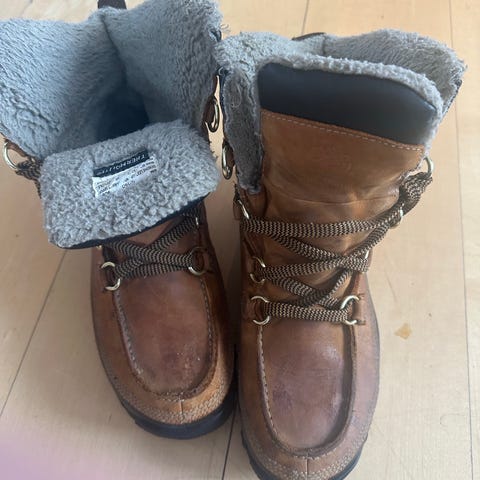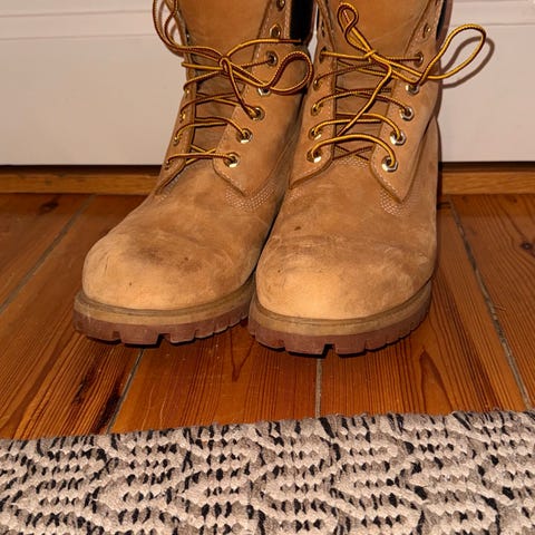 Klassiske Timberland vinterstøvler i størrelse 42. Støvlene har lærmateriale og er designet for vinterbruk. De har solide gummisåler med godt mønster for grep. Innvendig fôring og polstret ankel for komfort.