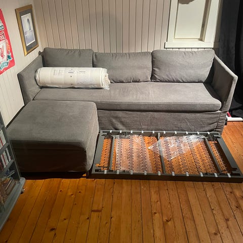 Den er i pen stand uten synlig merker som jeg kan se, men en av pinnene under sofaen har fått seg en liten knekk under monteringen