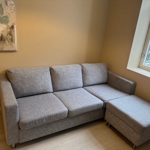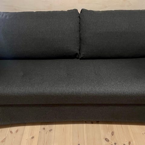 Pent brukt sovesofa fra JYSK. Aldri brukt sovesofafunksjonen. Sofaen har stått inne på kontoret til mannen og har nesten ikke blitt sittet i. Vi har hund som har ligget i sofaen noen ganger. Den ble kjøpt for ca 2 år siden.