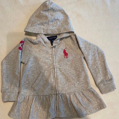 Polo Ralph Lauren ullgenser i størrelse 56 for jente. Står 60, men denne er liten i str. passer 12-18 mnd. Genseren er rosa og laget av 90 prosent ull.