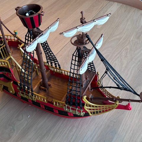 Kaptein Sabeltann Piratskip lekesett med flere tilbehør og figurer. Inkluderer 2 piratskip med seil, tauverk og kanoner, samt flere piratfigurer og diverse små gjenstander som skattekiste, kompass, og andre piratrelaterte elementer. Passer til lek og samling. Har en kule til kanonene,men skal prøve å finne flere etterhvert som jeg rydder.