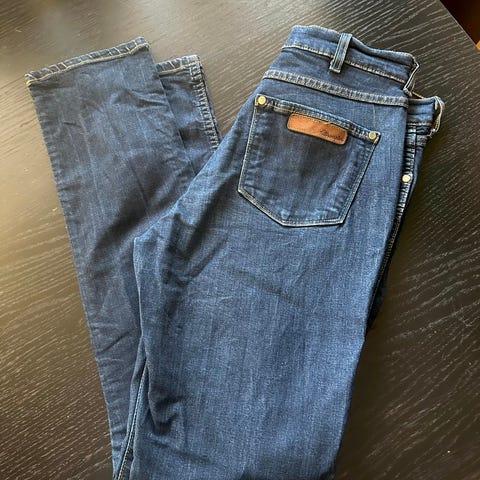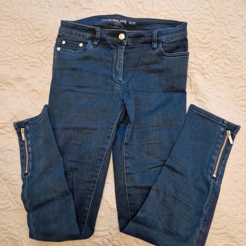 Low rise jeans fra Marie Philippe i 98% bomull og 2% elastan. Buksa har litt glitter i stoffet over hele seg, men det er svakt. Bootcut passform. Indre bensøm er 80cm, og ytre bensøm er 102cm.
