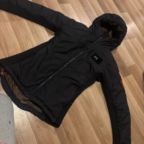 Anorakken har to side lommer. Den har også en lomme på brystet. Det er knepping og borrelås i halsen.