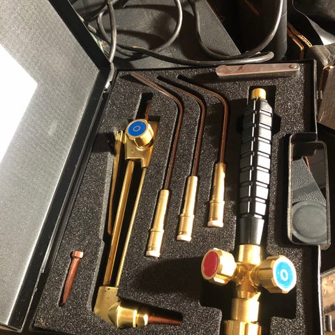 AGA X 21 Original sveisesett med rød oppbevaringskasse. Inneholder ulike sveisebrennere og tilbehør for presisjonsarbeid. Egnet for metallbearbeiding og reparasjoner.