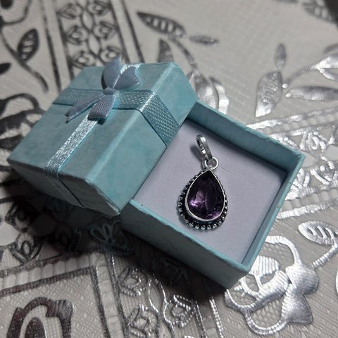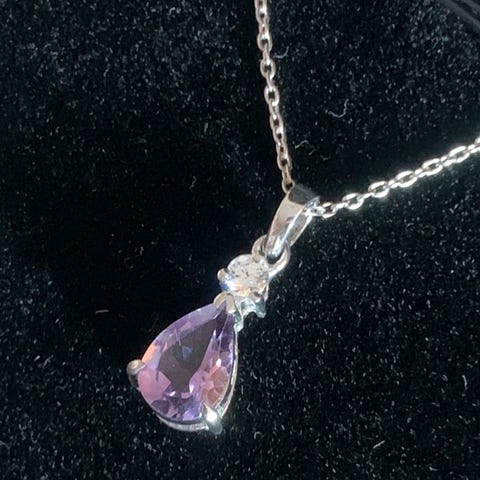 Anhenget har en elegant dråpeform og naturlige fargespill i lilla og hvitt, typisk for ekte ametyst.