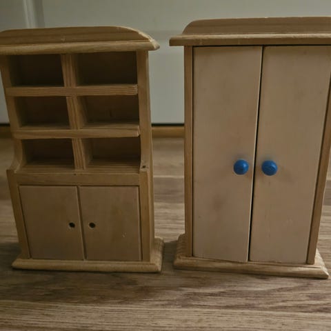 Baderoms møbel til Lundby hus. Har blitt lagret i mange år. Må ha nytt elektronikk sett om det skal tas i bruk. Selv har disse aldri blitt brukt eller kjøpt komplett. Trengs både rens og vask og litt liming av tapet og knotter. Men med litt kjærlighet blir nok disse fin. Eller til folk som restaurerer små dukkehus som hobby. Disse ble kjøpt ny en gang mellom 2014-2017