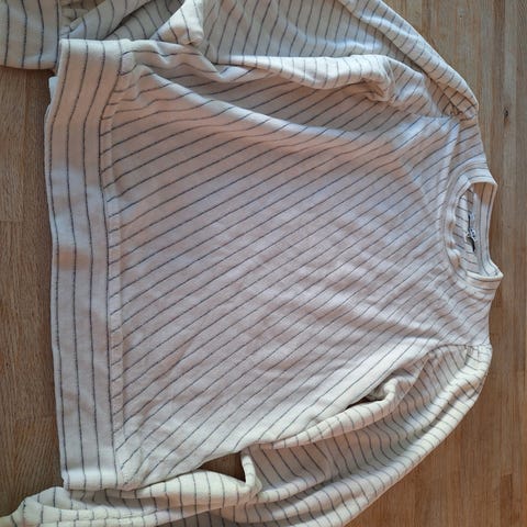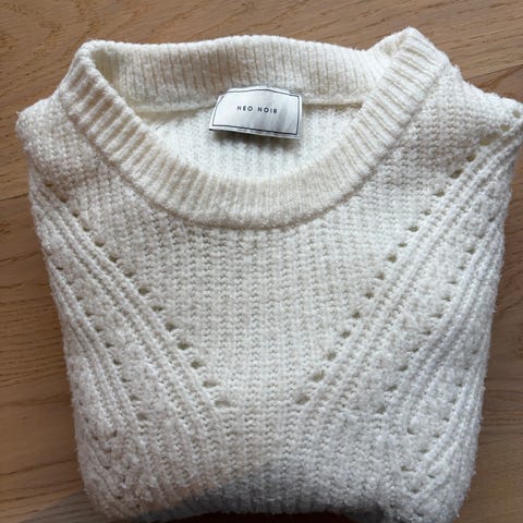 Ganni Genser i hvit farge, størrelse S, laget av 80% bomull. Genseren har et kabelstrikket mønster og dekorative knapper på skulderen. Den er brukt og derfor selges billig! Kan møtes i Oslo/ Frogner eller sendes i posten:)