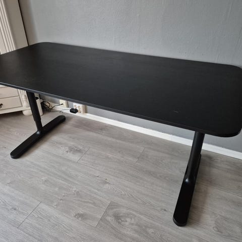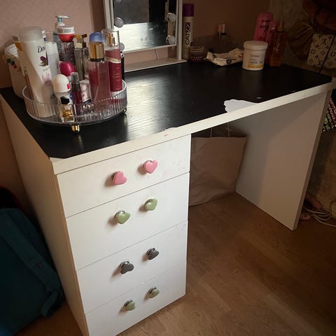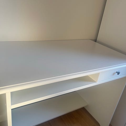 Pent hvitt skrivebord med oppbevaring. Et lite hull på bordplaten som har vært dekt med musematte. (Se bilder)