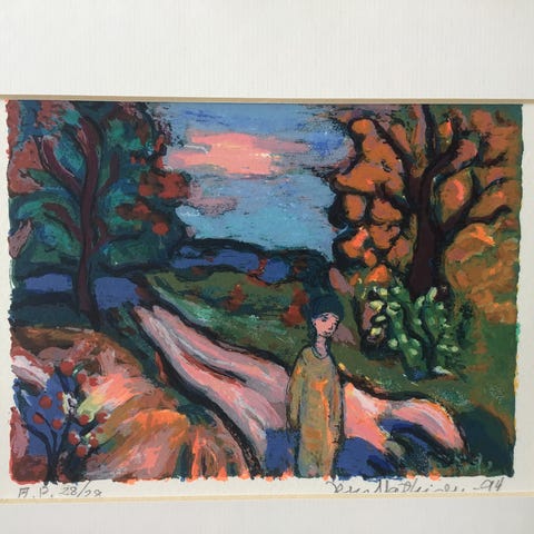 Jens Mathisen litografi nummerert 83 av 275. Signert og datert 1991. Motiv med figur og natur i farger. Inrammet med passepartout og glass.