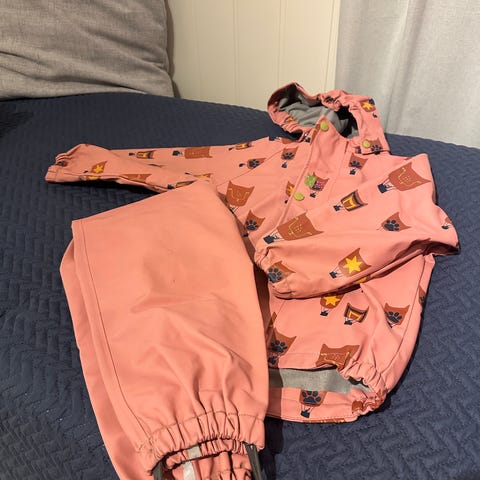 Ingen hull eller synlig slitasje. Barna har aldri blitt våte gjennom. Marineblå i fargen.
