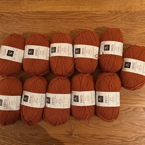 11 og ett litt brukt nøste. (Har strikket en prøvelapp)