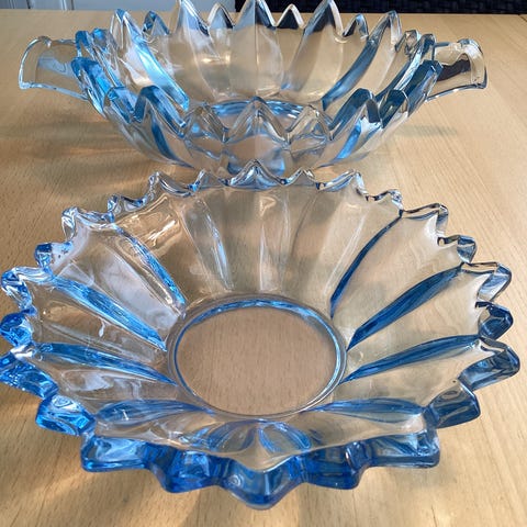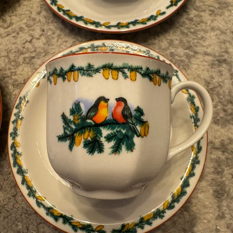 2 tallerkener, 4 kopp-skåler og 4 kopper, til 250 kroner. Kan sendes eller hentes på Mosby.