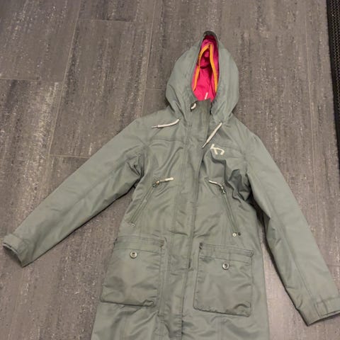 Pent brukt parkas fra Kari Traa i størrelse M. Grå farge med rosa fôr. Følger også med ekstra fôr som man kan feste i jakka, evt ta ut. Dette gjør at den funker både på sommeren, men også på mer kjølige høstdager. Den har flere lommer foran og en justerbar midje med belte. Designet for å gi beskyttelse mot regn og vind.