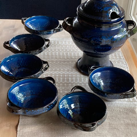 Skuffene er i porselen (med stempel, se bilder). Kassen er i treverk.