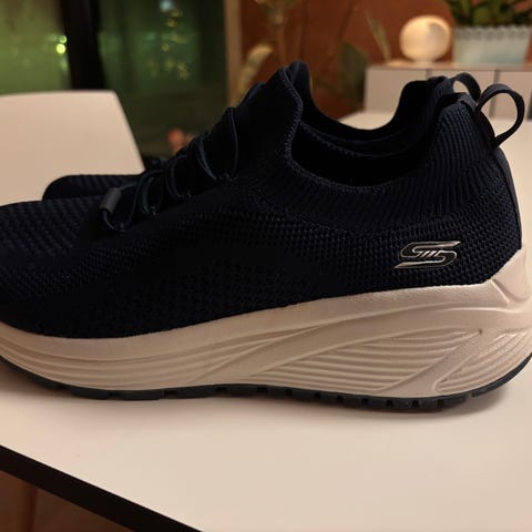 Skechers Sneakers joggesko i størrelse 40 og svart farge med kilehæl. Skoene har en elastisk overdel som gir god passform og komfort.