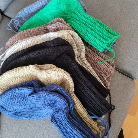 Jeg har andre størrelser og plagg i både hekle og strikke teknikker tilgjengelig på min profil. Jeg tar også bestillinger om du har noe flott du ønsker deg, men ikke har tid til å lage selv. Jeg strikker jevnt og har ingen problem med å følge oppskrifter eller mønster med flere farger😁