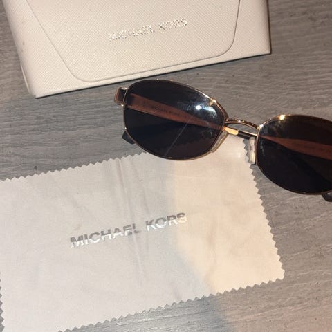 Michael Kors dame solbriller med mørke brune glass og mørk brun innfatning. Det er ingen skader, ingen riper i glassene. Kjøpt sommer -24, har mange par solbriller så de er ikke mye brukt. Nypris rundt 2000 kr, selges kr 900,-
