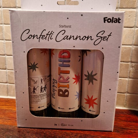 Selger uåpnet konfetti kanoner. Disse kommer det strimler ut, lett å rydde opp etterpå.