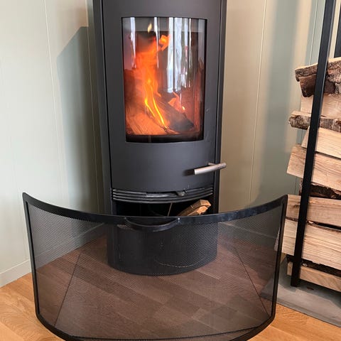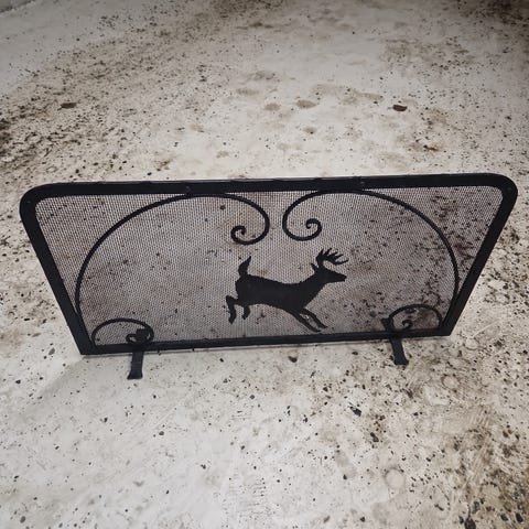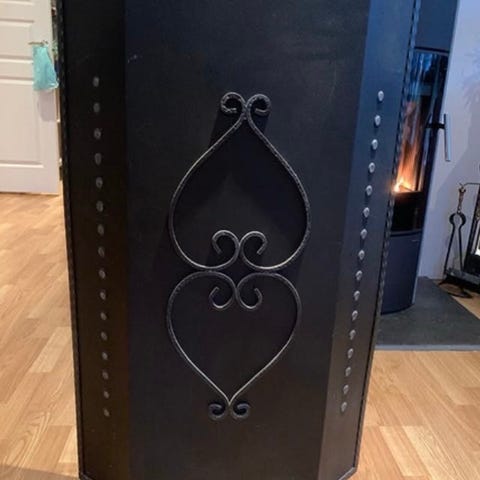 Bredde er 90 cm og høyde 45 cm . Egnet for bruk som beskyttelse foran peis. Materialet er metallnetting med ramme i svart utførelse.