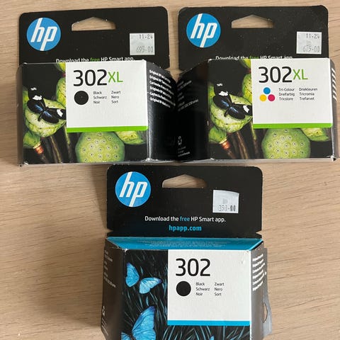 1x hver av sort (Black), blå (Cyan), gul (Yellow) og rødlilla (Magenta), og også 1x foto (Photo).