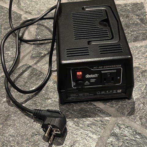 Transformator som konverterer 230 V til 110 V. Brukes for å koble til utstyr med amerikansk eller japansk støpsel (jordet eller ujordet) apparater i Norge. Maks. belastning: 300 W. Inneholder sikring: treg 2 A / 250 V. For innendørsbruk.