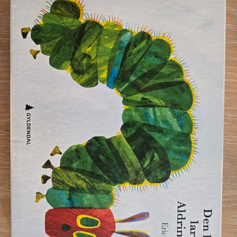 handler om larven Aldrimett som bokstavelig talt spiser seg gjennom ukedager, epler, plommer, jordbær og faktisk også sidene i boka, inntil den en dag er blitt helt mett og blir en sommerfugl? Boken utkom første gang på norsk i 1973.