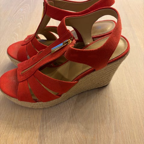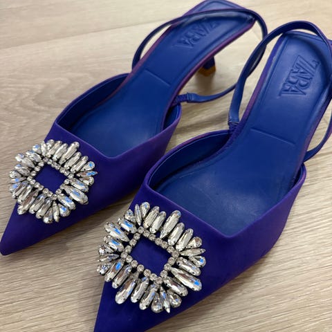 Hælen er ca. 9 cm høy (målt bak, fra laveste til høyeste punkt). Svart og gullfarget stoff. Skoene er veldig fine til f.eks. en grønn kjole.