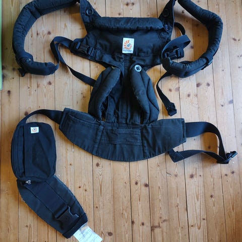 Svært pent og lite brukt ergobaby omni 360 cool air i fargen oxford blue. God bæresele som passer fra nyfødt uten innlegg, luftig mesh panel, taske på magebelte og "hette" i glidelåsen på toppen.