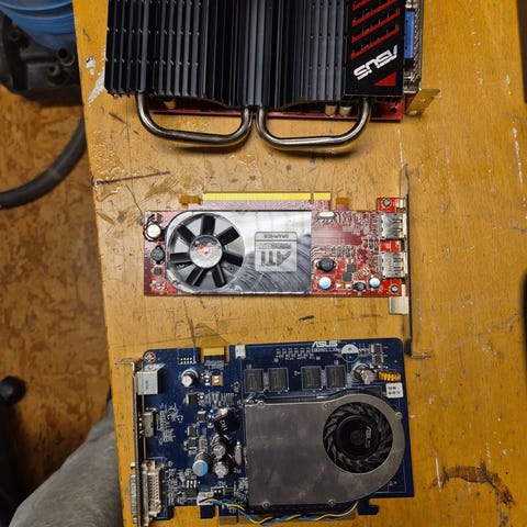 Det ene kortet er noe degradert, men funket fint som kort nr2 i SLI-konfigurasjon, sist det var i bruk.