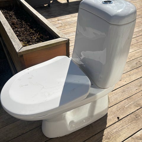 toalett med innebygd sisterne i hvit farge. Toalettet har et klassisk design og er laget av keramisk materiale. Passer for standard baderom og har trykknapp for skylling på toppen av sisterne.