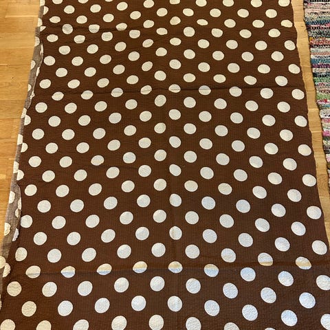 Mønstret stoff i bomull med vertikale striper i oransje, brunt og rødt på lys bakgrunn. 60-70 tallet? Bredde 114 cn, lengde 200 cm.