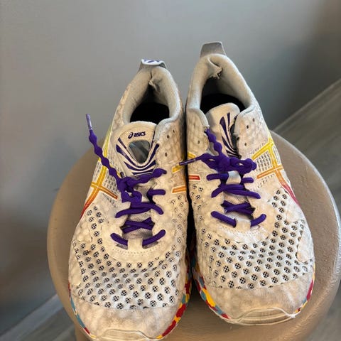 Asics løpesko i størrelse 39. Designet for løping med fargerik overflate og slitesterk såle. Egnet for daglig trening og løpeaktiviteter.