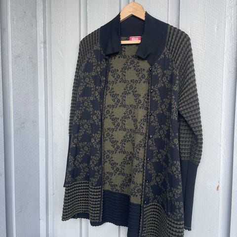 Den er str XL, men er veldig fast strikka og eg vil heller kalle den ein stor M.