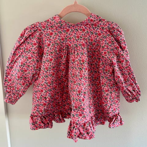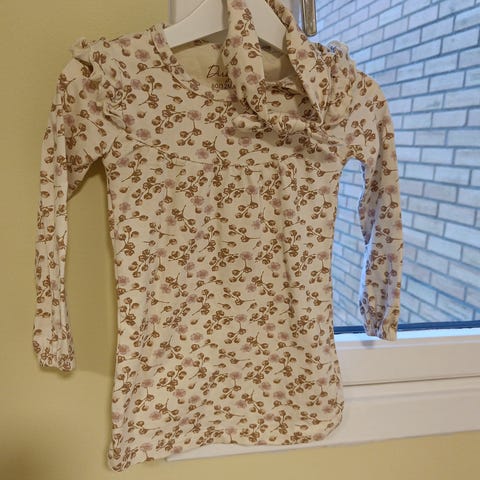 Rosa langarmet kjole med små blomstermotiv og knapper i halsen (ca 45 cm lang), bomull/polyester, og ett par hvite strømpebukser/tights, str 12-18 mnd (80/86). Kjøpt i England og er fra merket George. God kvalitet. En flott kjole til barnehagen og bursdagsselskap.