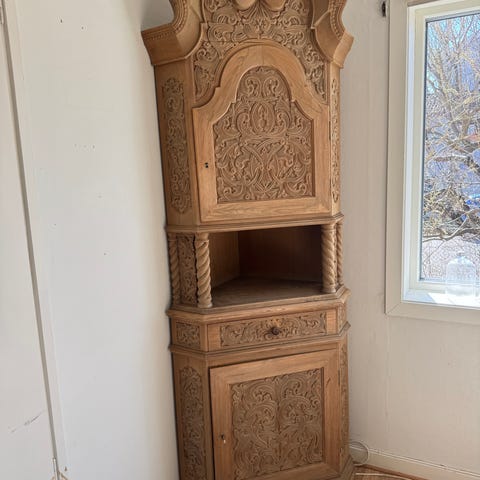 Nydelig og solid vintage skap i shabby chic / bohemsk stil med vakre utskjærte fronter. Skapet er kjøpt hos interiørbutikk, den gir karakter og varme til rommet.
